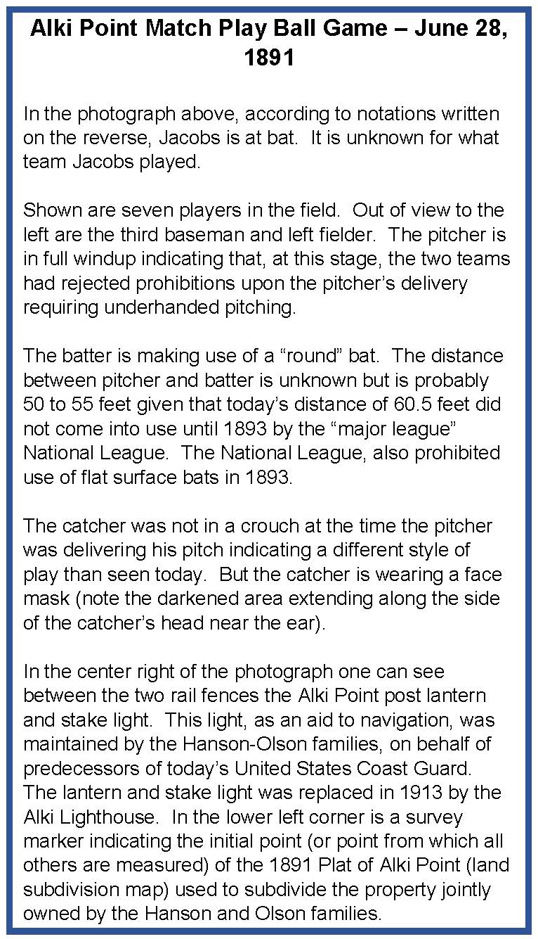 Alki with its unique scenic, outdoor and beach attributes was in a position to host not only baseball play but a full array of leisure time and recreational opportunities as Seattle grew and developed. As the Hanson and Olson families’ land fell into developers’ hands, recreational opportunities came to be increasing shared by Alki residents and visitors alike as they were first shared in the 1891 match play season. This legacy continues to this day.